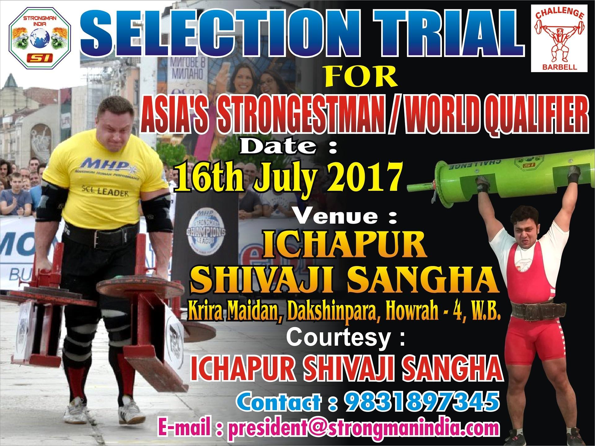 Selection Trial for SCL Asia’s Strongestman / World Qualifier 2017Official Strongman IndiaJuly 12, 2017Events0 Comments Selection Trial for SCL Asia’s Strongestman / World Qualifier 2017 Selection Trial for SCL Asia’s Strongestman / World Qualifier 2017 Date: 16th July, 2017 Vanue: Ichapur Shivaji Sangha Krira Maidan, Dakshinpara, Howrah – 4, West Bengal. Contact: 9831897345 Email: president@strongmanindia.com Presented by: “Strongman India” & “Challenge Barbell” Courtesy: Ichapur Shivaji Sangha Share this post SCL Asia’s Strongestman / World Qualifier 2017 – 26 & 27th August, Dehradun, Uttarakhand National Loglift and Axle Deadlift in Bhopal 29th October 2017 Related Posts Level Up Endurance with Treadmill Workouts Posted on October 14, 2024 SCL World Championship – U90 & U105 , 2018, Finland Posted on September 3, 2018