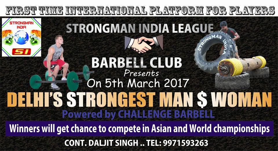 Strongman India presents Strongman India League, New Delhi on March, 2017 at Delhi. Organized by Barbell Club and Powered by CHALLENGE BARBELL.
